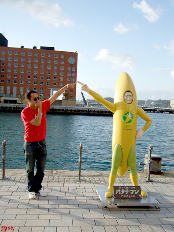 香蕉意外成為本趟旅行焦點,我聽熟了《包娜娜一家人》之歌,轉到了包娜夫君吊飾的扭蛋,臨別前一天,還走過了產香蕉的九州頂端,跟猥褻的蕉客合影留念。 圖說:Day 7/2007/10/27/門司港/君子之蕉淡如水